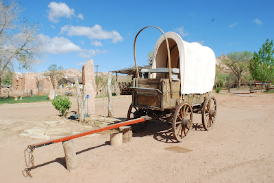 Au menu sur la route, Mexican Hat, un village ainsi nomme car au loin se trouve une roche au profil de sombrero. Mais surtout, le ‘bluffant’ Fort Bluff ( !!!), ou se trouve fort bien reconstitue un village mormon. Nous entrons tour a tour dans chacune des cabines, Martin nous joue un petit air de piano dans la salle commune (on ne dit pas saloon, enfin, on est chez les mormons !!!) et Nicole file se pavaner sur la diligence. Une fois de plus, on s’y croirait Etape superbe autant qu’inattendue, et qui nous donne du baume au cœur avant de repartir car apparemment le risque de pluie se fait plus pressant.